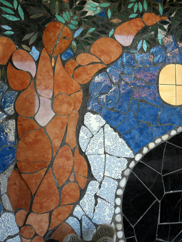 La visita di alcuni mesi fa alla casa museo Vincent City, dove tra il 2001 e il 2005 realizzai molti dei miei mosaici in ceramica e altri materiali poveri, è stata l’occasione per fotografare i dettagli delle tante opere. Qui presento un piccolo mosaico su muro esterno, in una nicchia di 120x90cm, Donna Ulivo e onda mediterranea. Un mio divertissement del 2001, un paesaggio mentale, giocando con la figura dell’ulivo, poi con il mare, idealizzandolo in un’onda in ceramica, pietre di campagna e ciottoli, nel cui tessuto c’è il caldo di una fantasia di girasoli su sfondo rosso. Poi la luna al centro e un uccello simbolico arancione posato sulla cresta dell’onda. Di seguito alcuni particolari, principalmente sulla figura dell’ulivo antropomorfo, realizzata in rilievo, con tessere molto grandi tondeggianti. Il bello di questo intervento è nel come il paesaggio muta, a seconda dell’angolazione da cui si guarda l’opera, come si vede nella sequenza sulla donna/ulivo.