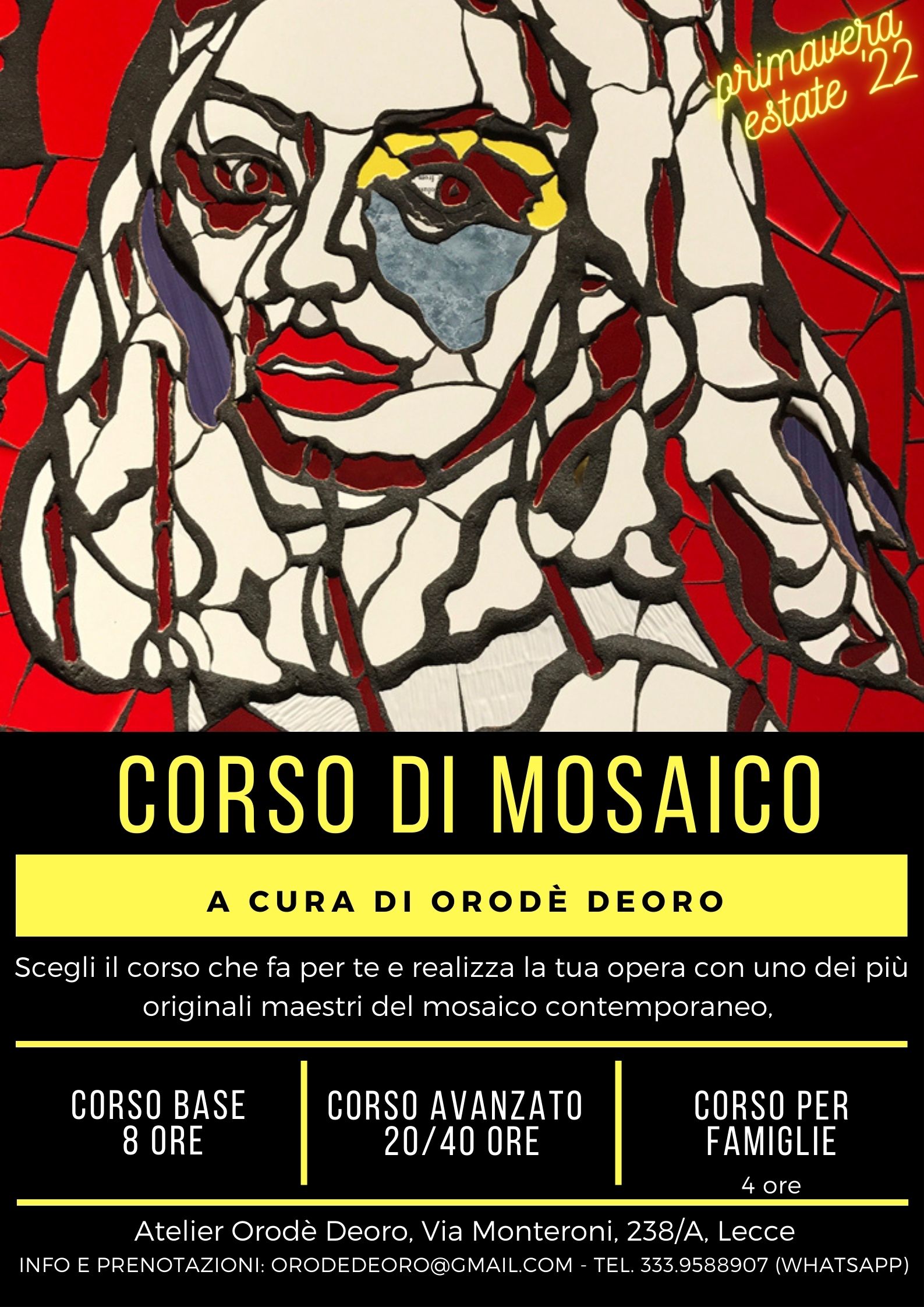 Dimostrazioni e applicazioni del mosaico artistico, su rete e su supporto. Uso della ceramica, piastrelle, pietre, oggetti vari, per elaborati di indirizzo plastico-musivo. L’uso degli strumenti, delle colle, dei supporti, e delle metodologie. Gli studenti saranno accompagnati a creare un’opera, cercando un modo personale di creazione musiva, poiché il mosaico non è, come era sembrato sino a qualche decennio fa, una forma d’arte antica, iconica in senso fortemente statico. Le recenti esposizioni internazionali ci mostrano come il mosaico stia cambiando nella sua morfologia, raccordandosi con altre tecniche espressive e passare così a un ruolo dinamico nel tentativo di trovare una via nuova per l’arte di domani o consentendo agli artisti una più vasta possibilità di scelta. Nell’arco di 4 giorni scoprirai l’artista del mosaico ch’è in te! Vivrai l’esperienza del mosaico come forma d’arte pura!